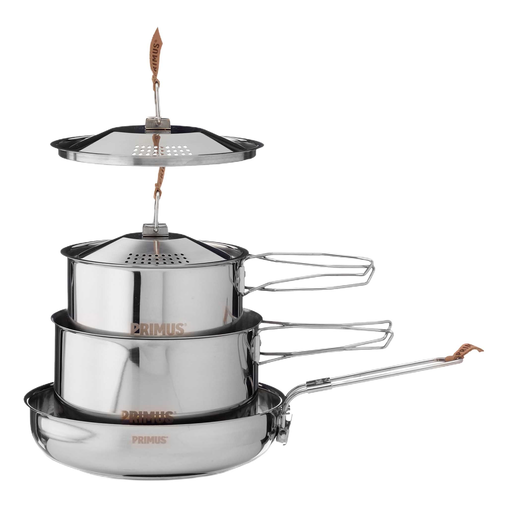 • Stainless steel lids with leather tags and colanders