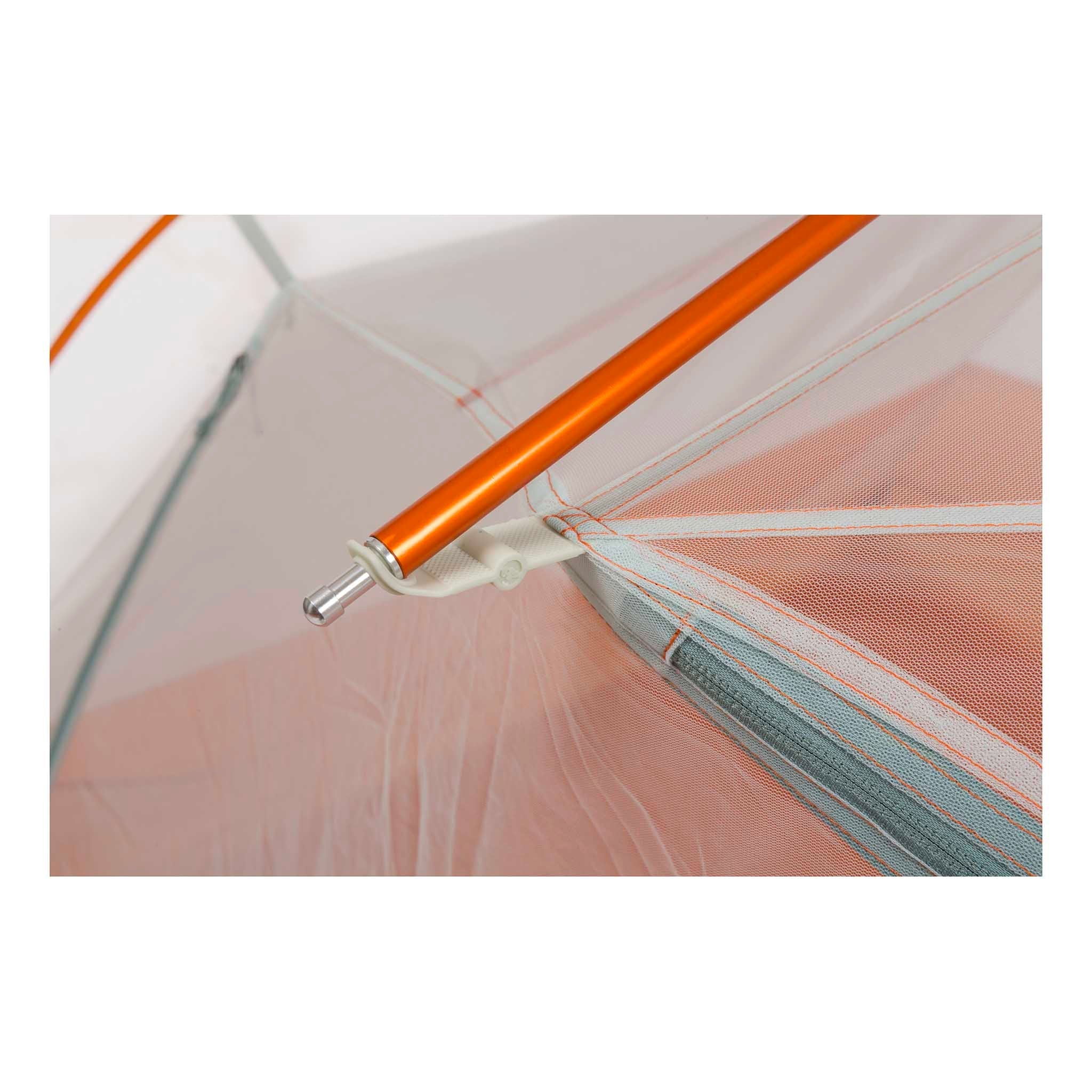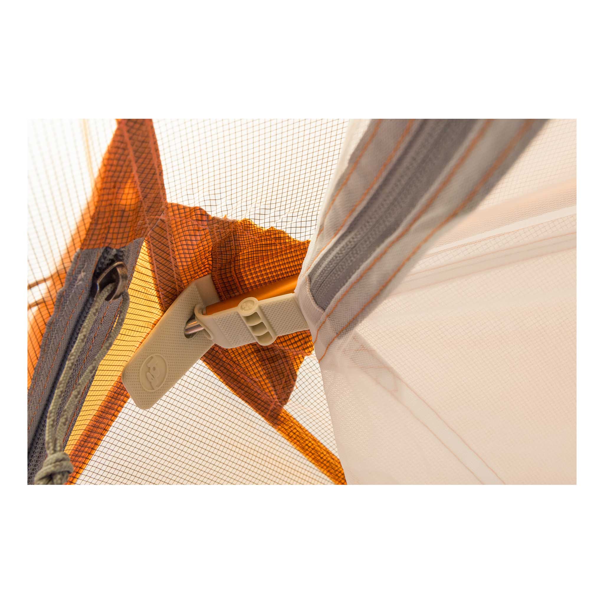 - Construction exclusive des angles de la tente avec la boucle TipLok™ pour rationaliser le montage de la tente en combinant trois fonctions : capture sécurisée de l'extrémité de l'arceau, fixation et tension du double toit, et boucle de fixation.